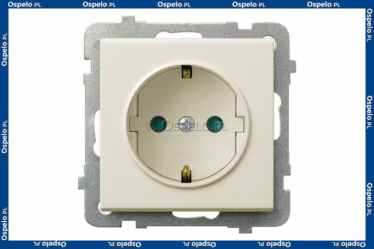 GP-1RSP/m/27 Gniazdo pojedyncze z uziemieniem Schuko i przesłonami torów prądowych 16A (Zaciski śrubowe) Ecru Ospel Sonata - Widok z przodu