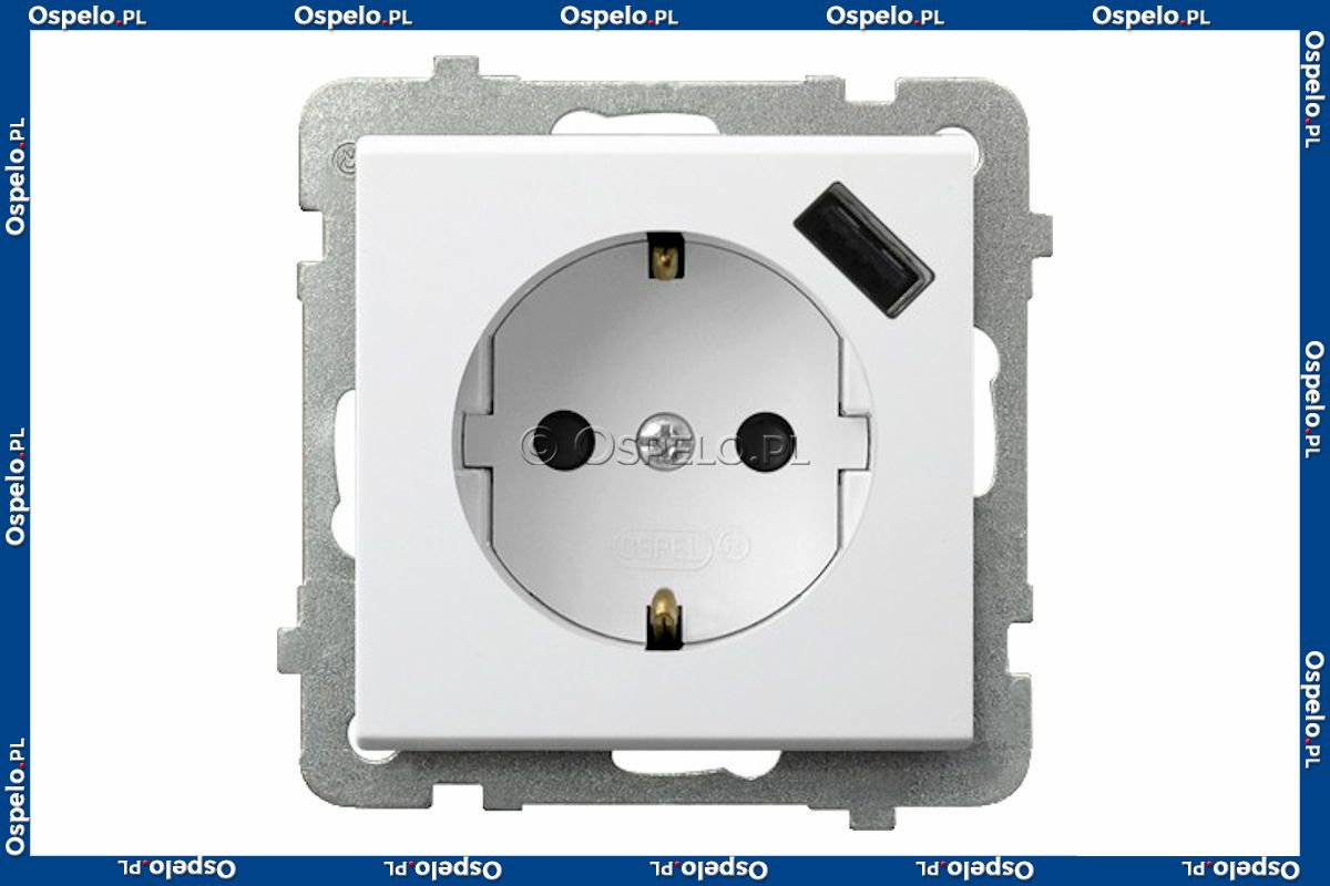 GP-1RSPUSB/m/00 Gniazdo pojedyncze z uziemieniem Schuko i ładowarką USB 5V 2,1A oraz z przesłonami torów prądowych 16A (Szybkozłącza) Biały Ospel Sonata - Widok z przodu