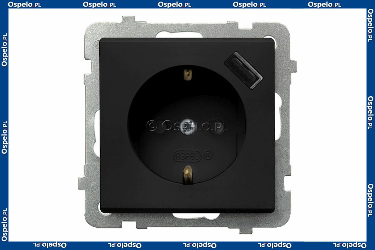 GP-1RSPUSB/m/33 Gniazdo pojedyncze z uziemieniem Schuko i ładowarką USB 5V 2,1A oraz z przesłonami torów prądowych 16A (Szybkozłącza) Czarny Metalik Ospel Sonata - Widok z przodu