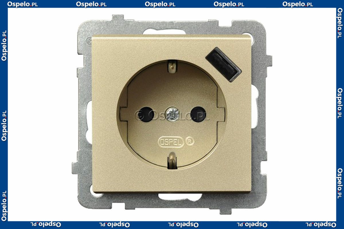 GP-1RSPUSB/m/39 Gniazdo pojedyncze z uziemieniem Schuko i ładowarką USB 5V 2,1A oraz z przesłonami torów prądowych 16A (Szybkozłącza) Szampański Złoty Ospel Sonata - Widok z przodu