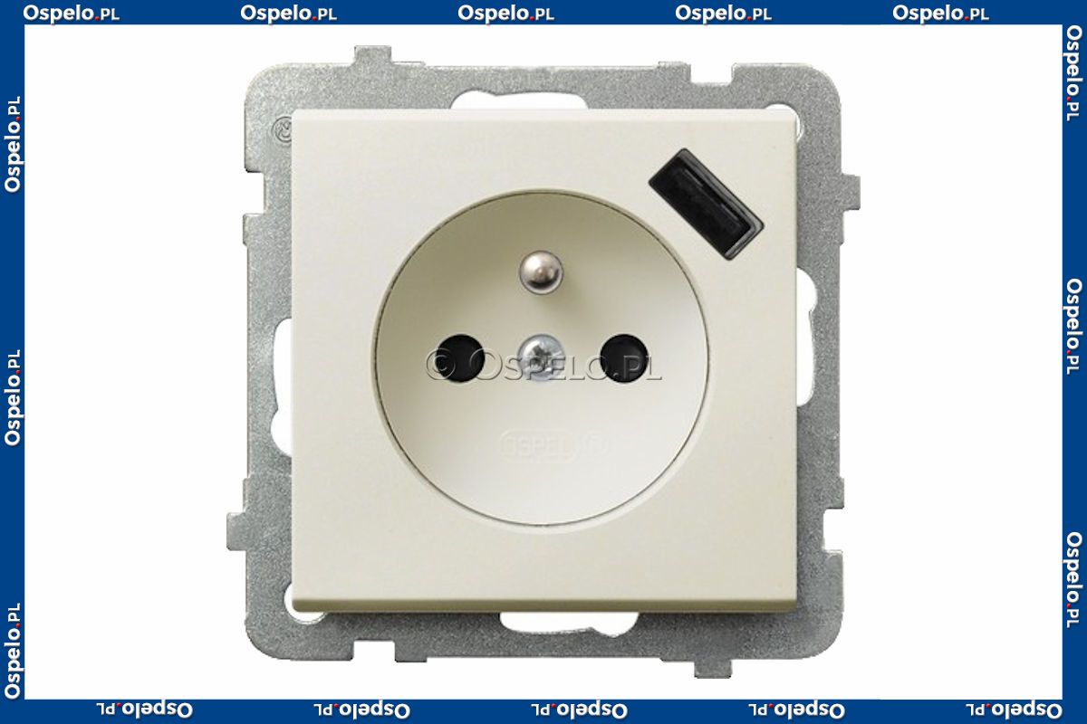 GP-1RZPUSB/m/27 Gniazdo pojedyncze z uziemieniem i ładowarką USB 5V 2,1A oraz z przesłonami torów prądowych 16A (Szybkozłącza) Ecru Ospel Sonata - Widok z przodu