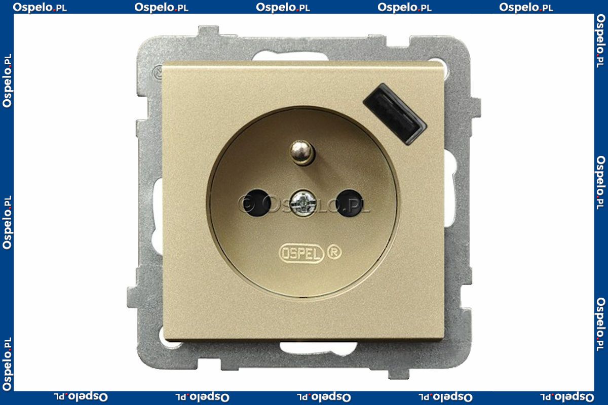 GP-1RZPUSB/m/39 Gniazdo pojedyncze z uziemieniem i ładowarką USB 5V 2,1A oraz z przesłonami torów prądowych 16A (Szybkozłącza) Szampański Złoty Ospel Sonata - Widok z przodu
