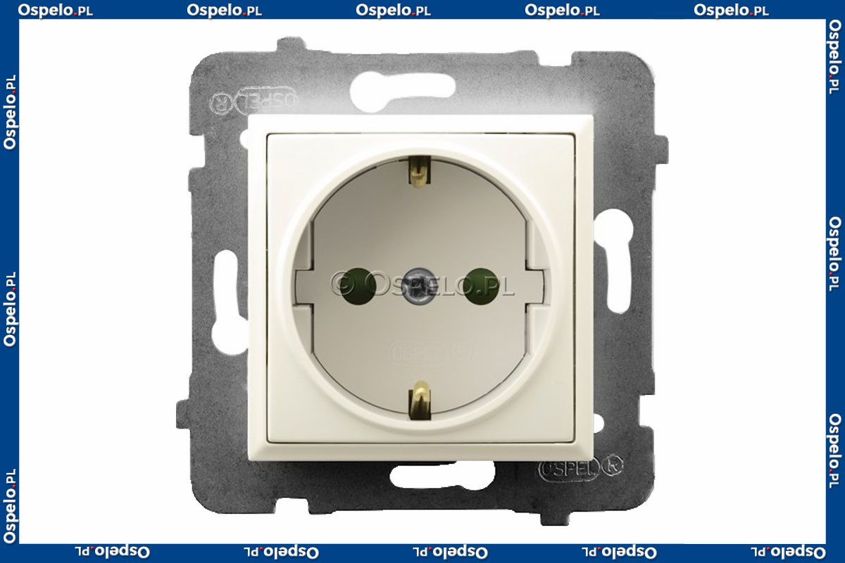 GP-1USP/m/27 Gniazdo pojedyncze z uziemieniem Schuko i przesłonami torów prądowych 16A (Zaciski śrubowe) Ecru Ospel Aria - Widok z przodu
