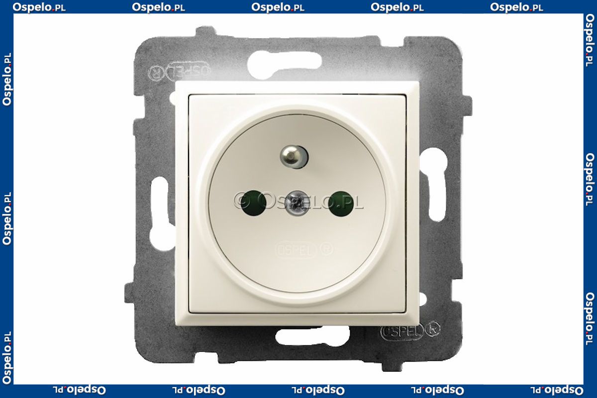 GP-1UZP/m/27 Gniazdo pojedyncze z uziemieniem z przesłonami torów prądowych 16A (Zaciski śrubowe) Ecru Ospel Aria - Widok z przodu