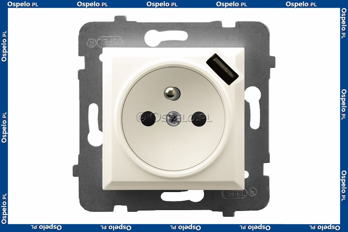 GP-1UZPUSB/m/27 Gniazdo pojedyncze z uziemieniem i ładowarką USB 5V 2,1A oraz z przesłonami torów prądowych 16A (Szybkozłącza) Ecru Ospel Aria - Widok z przodu