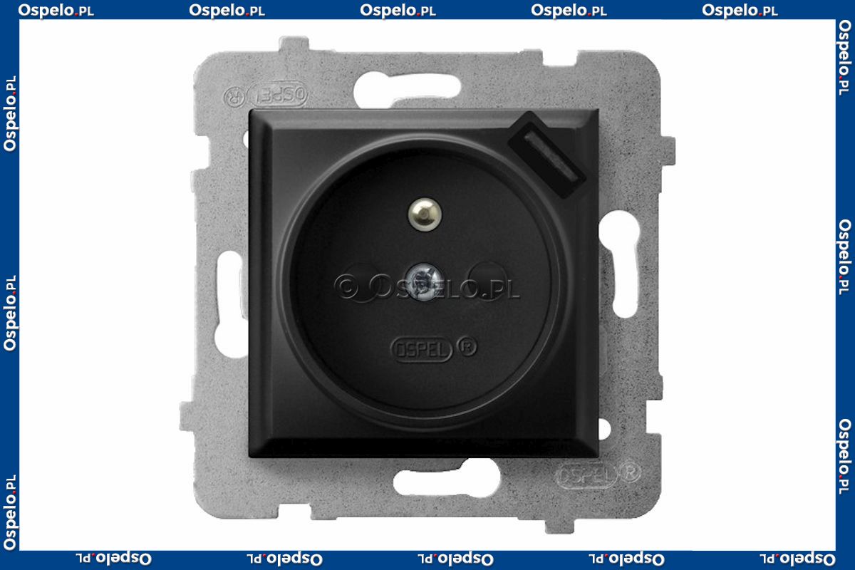 GP-1UZPUSB/m/33 Gniazdo pojedyncze z uziemieniem i ładowarką USB 5V 2,1A oraz z przesłonami torów prądowych 16A (Szybkozłącza) Czarny Metalik Ospel Aria - Widok z przodu