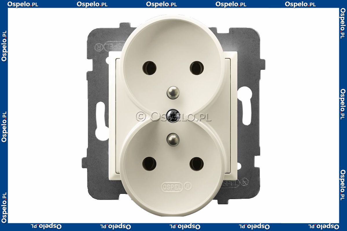GP-2URAZ/m/27 Gniazdo podwójne z uziemieniem do ramek Prestige 16A (Zaciski śrubowe) Ecru Ospel Aria - Widok z przodu