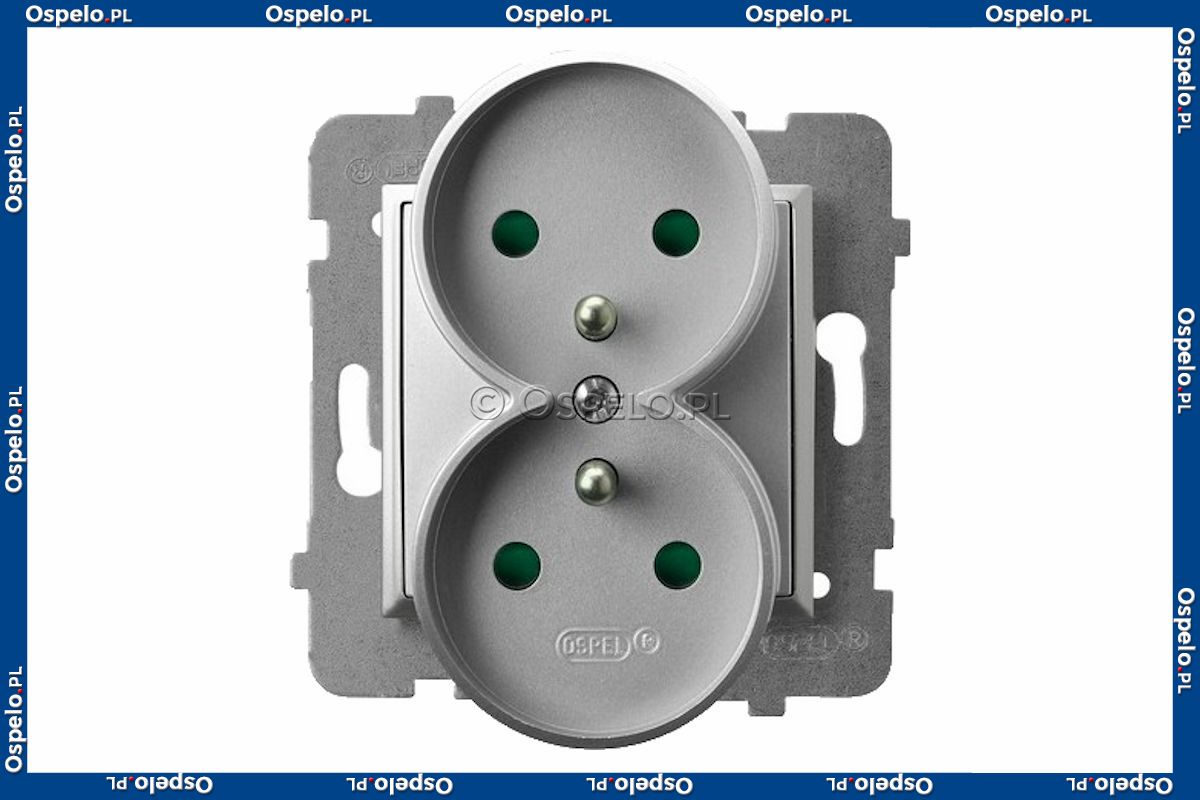 GP-2URAZP/m/18 Gniazdo podwójne z uziemieniem z przesłonami torów prądowych do ramek Prestige 16A (Zaciski śrubowe) Srebro Ospel Aria - Widok z przodu