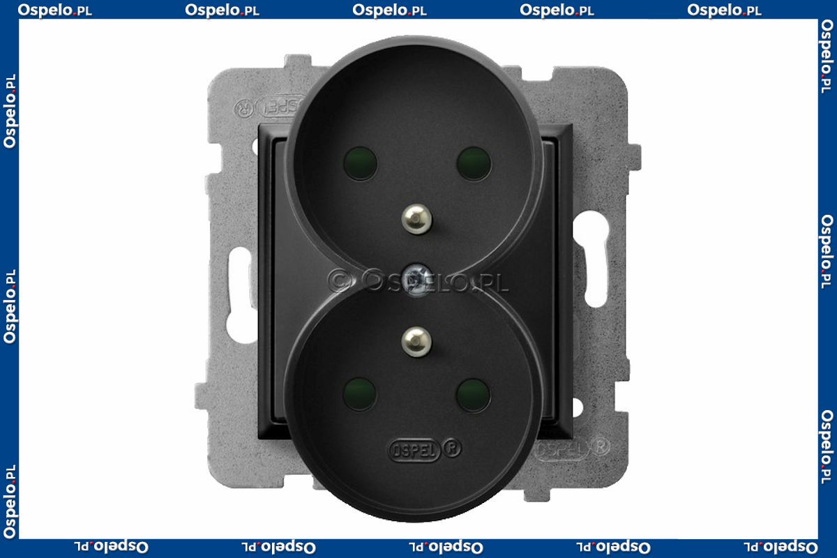 GP-2URZP/m/33 Gniazdo podwójne z uziemieniem z przesłonami torów prądowych 16A (Zaciski śrubowe) Czarny Metalik Ospel Aria - Widok z przodu