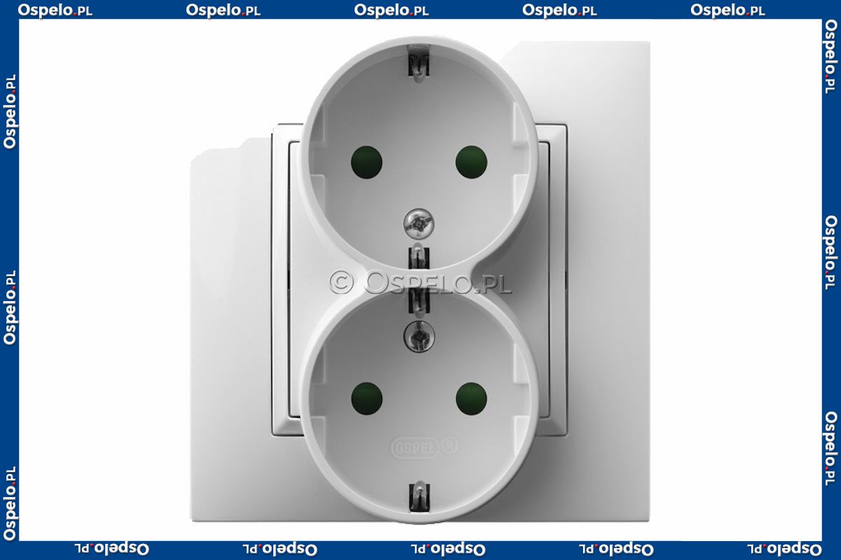 GP-2USP/00 Gniazdo podwójne z uziemieniem Schuko i przesłonami torów prądowych, gniazdo kompletne, nie pasujące do ramek 16A (Zaciski śrubowe) Biały Ospel Aria - Widok z przodu
