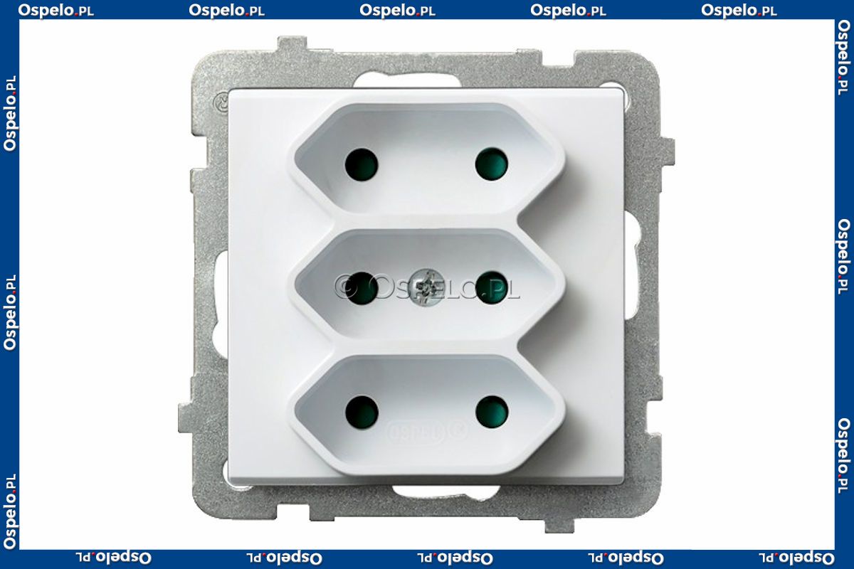 GP-3RP/m/00 Gniazdo potrójne na płaskie wtyczki z przesłonami torów prądowych 2,5A (Zaciski śrubowe) Biały Ospel Sonata - Widok z przodu