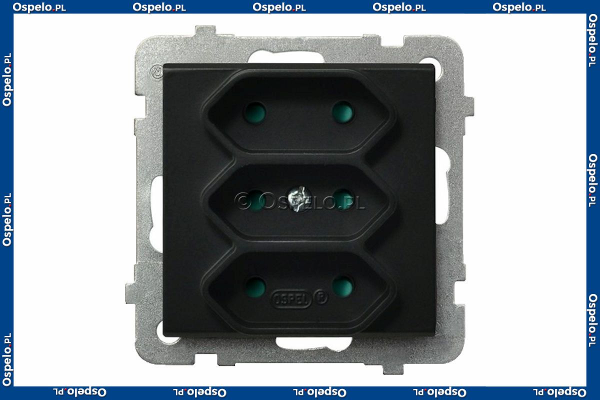 GP-3RP/m/33 Gniazdo potrójne na płaskie wtyczki z przesłonami torów prądowych 2,5A (Zaciski śrubowe) Czarny Metalik Ospel Sonata - Widok z przodu