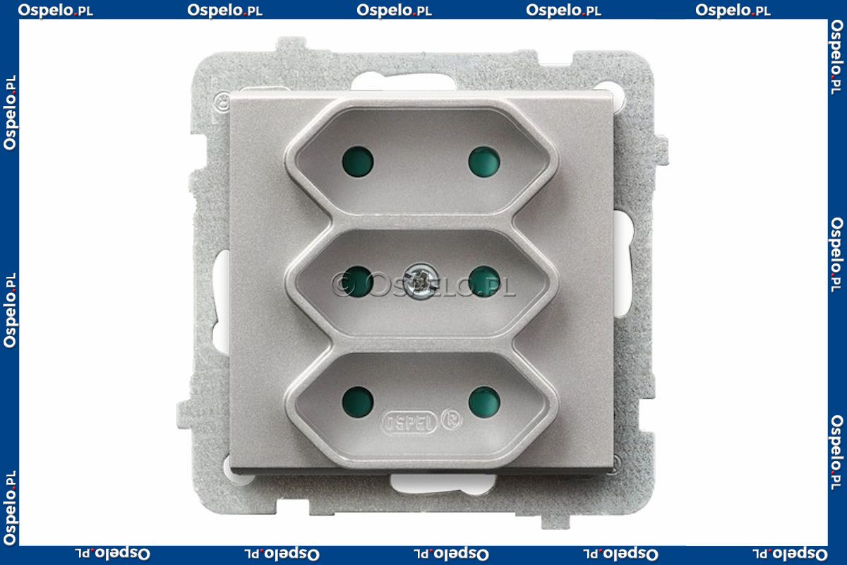 GP-3RP/m/38 Gniazdo potrójne na płaskie wtyczki z przesłonami torów prądowych 2,5A (Zaciski śrubowe) Srebro Mat Ospel Sonata - Widok z przodu