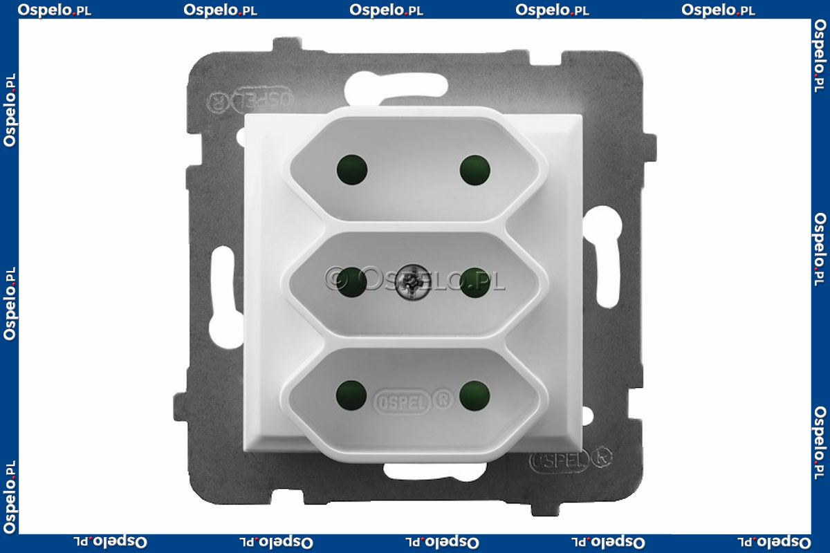 GP-3UP/m/00 Gniazdo potrójne na płaskie wtyczki z przesłonami torów prądowych 2,5A (Zaciski śrubowe) Biały Ospel Aria - Widok z przodu