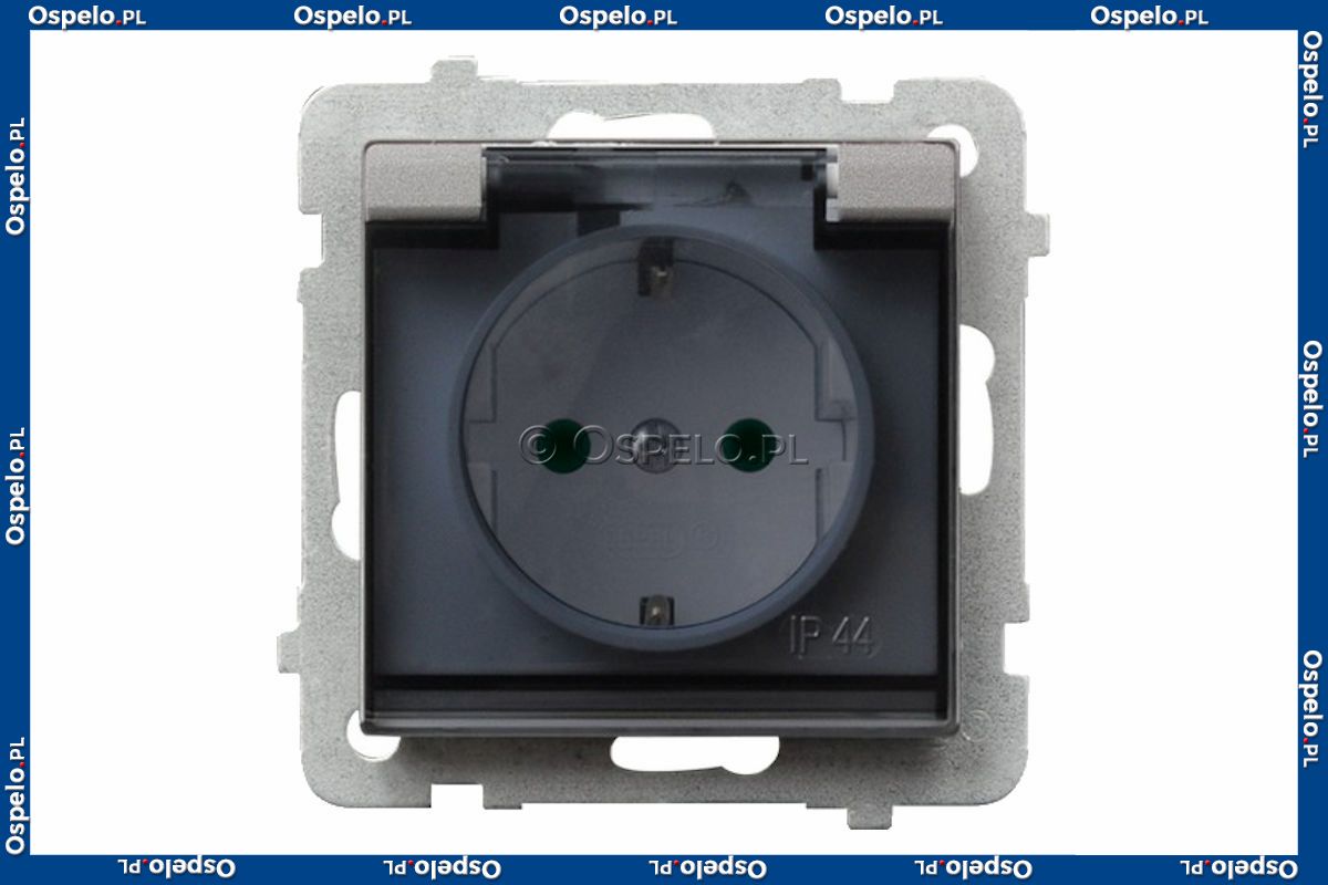 GPH-1RSP/m/38/d Gniazdo bryzgoszczelne z uziemieniem schuko IP44 z przesłonami torów prądowych, wieczko przezroczyste 16A (Zaciski śrubowe) Srebro Mat Ospel Sonata - Widok z przodu