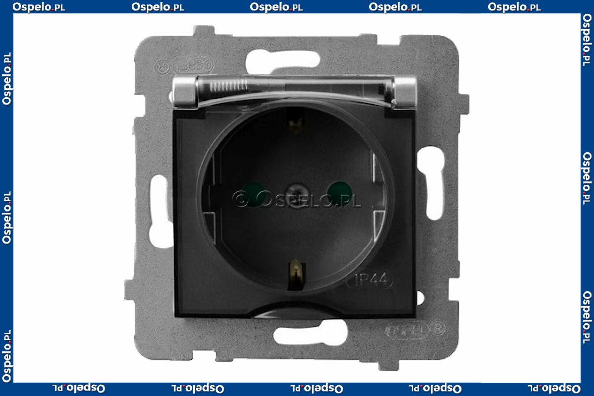 GPH-1USP/m/18/d Gniazdo bryzgoszczelne z uziemieniem Schuko IP44 i przesłonami torów prądowych, wieczko przezroczyste 16A (Zaciski śrubowe) Srebro Ospel Aria - Widok z przodu