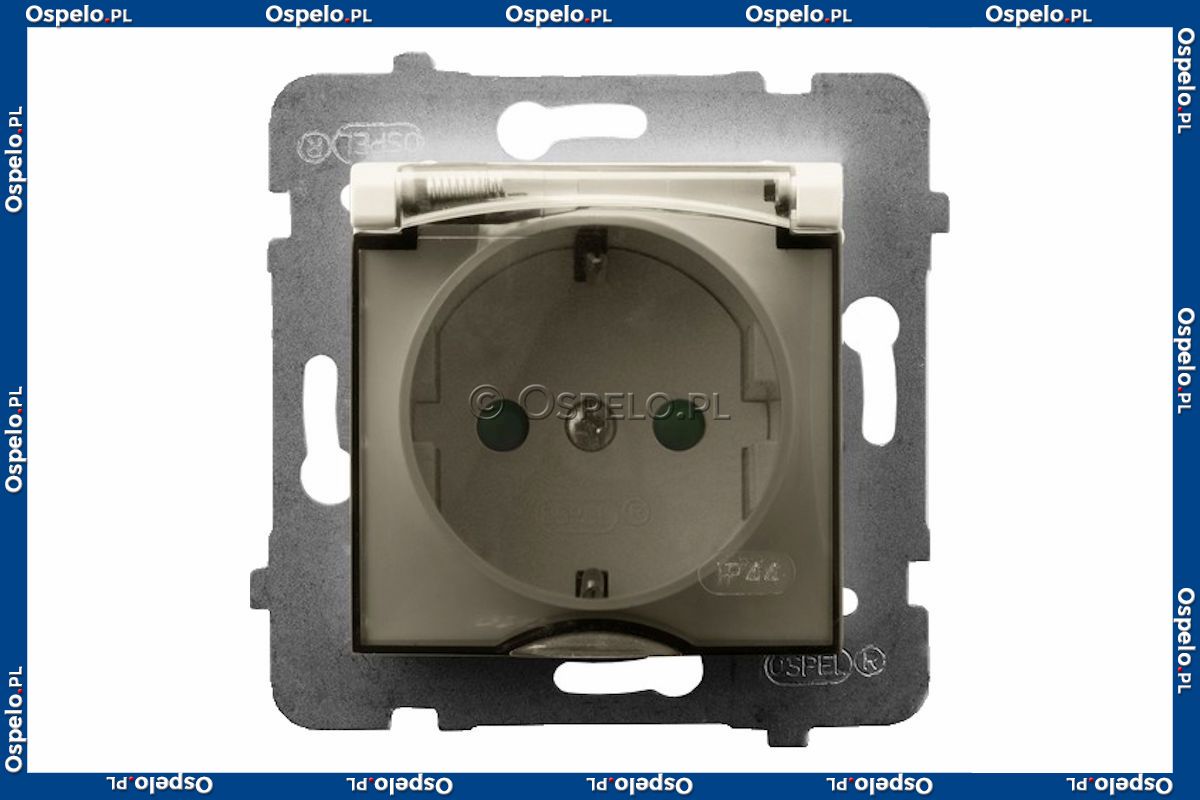 Gniazdo bryzgoszczelne z uziemieniem Schuko IP44 i przesłonami torów prądowych, wieczko przezroczyste 16A (Zaciski śrubowe) Ecru Ospel Aria