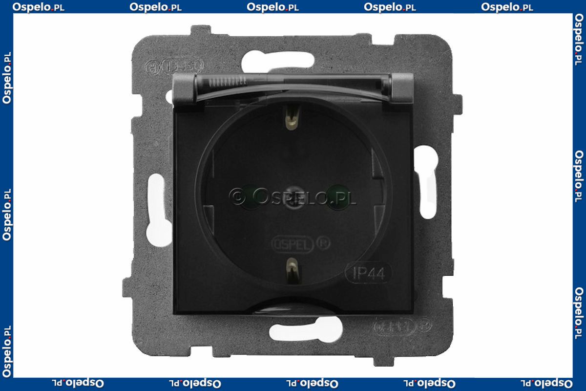 GPH-1USP/m/70/d Gniazdo bryzgoszczelne z uziemieniem Schuko IP44 i przesłonami torów prądowych, wieczko przezroczyste 16A (Zaciski śrubowe) Szary Mat. Ospel Aria - Widok z przodu